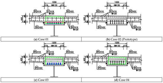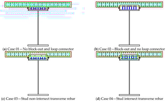 This prototype was used to develop the cases of prefabricated composite girders with different girder-to-deck connections in this study. Four cases were generated by adding loop reinforcement, changing the stud connector height and precast deck configuration from the prototype bridge, as indicated in Figure 5. The reinforcement spacing of each case is investigated in Section 3. It should be noted that the reinforcement spacing mentioned in this study is the spacing between reinforcement connectors connecting the precast deck and the grout.