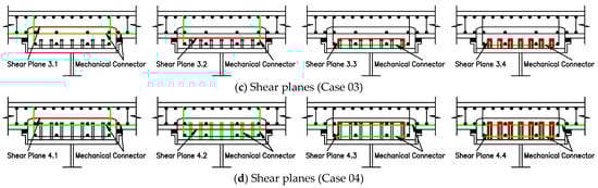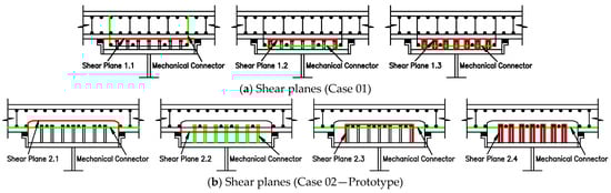 Figure 6 illustrates the cross section of prefabricated composite girders with different girder-to-deck connections proposed in this study. There are four cases proposed. These cases differ in details of reinforcement, stud connector, and precast deck structure. Since the connection with multi-step casting concrete, the design of the girder-to-deck interface connection is different from that of a conventional composite connection. The design of the girder-to-deck interface connection strongly influences the structural performance of the prefabricated composite girder. It includes three critical interface types: (1) interface of monolithic grout, (2) interface between the field-cast haunch and the precast deck, and (3) interface between the field-cast haunch and the steel girder. This study focused on interface types (1) and (2) because of the diversity of these interface types with different girder-to-deck interface connections. It is necessary for in-depth analysis to ensure accurate calculation of connection details. Consequently, the structural performance of the prefabricated composite girder is ensured. The shear planes (interfaces) of different girder-to-deck interface connections are shown in Figure 7. In Figure 7, the mechanical connector is the reinforcement or stud connector. It should be noted that these are only potential shear planes. Based on the evaluation of the number of reinforcements crossing the shear plane at a cross section and shear plane type (monolithic shear plane or cold-joint shear plane), the shear planes governing the reinforcement detail of cases 01, 02, and 04 are usually shear planes 1.1, 2.1, and 4.1, respectively. Particularly for Case 03, it is necessary to have a comparison between shear planes 3.1, 3.2, and 3.3. Therefore, not all shear planes are calculated in Section 3.3. The design of the interface type (3) is similar to the design for a conventional composite girder, with reference to Article 6.10.10 of the AASHTO LRFD.