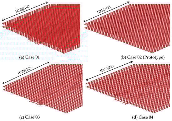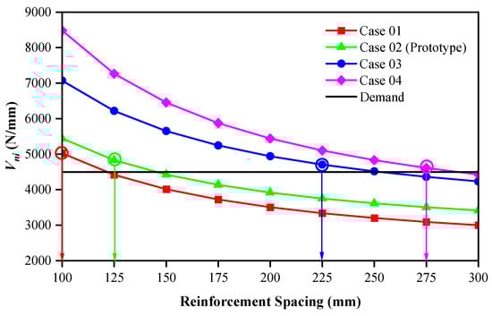 Case 01 was used for investigation. From Case 01, the initial values of the influential parameters mentioned above are adjusted so that the reinforcement-spacing demand increases and is approximately equal (≈150 mm). These cases are named cases 1.1 to 1.4 (because there are four influential parameters), as shown in Table 4. Therefore, in specific cases, design parameters can be selected to arrange more reasonable reinforcement spacing.