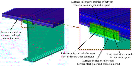 The interaction between members was considered using proper constraints and interactions, as shown in Figure 12. The shear connector was divided into two parts: the lower part was connected to the upper flange of the steel girder by a tie constraint, and an embedded constraint was used to connect the upper part to the connection grout. The grout–steel interaction was defined utilizing surface-to-surface contact, hard contact was adopted in the normal direction of the interface, a penalty function was adopted in the tangential direction of the interface, and the friction factor was 0.3 [14]. Reinforcements were placed inside the connection grout and concrete deck, and were connected to them by the embedded constraint.