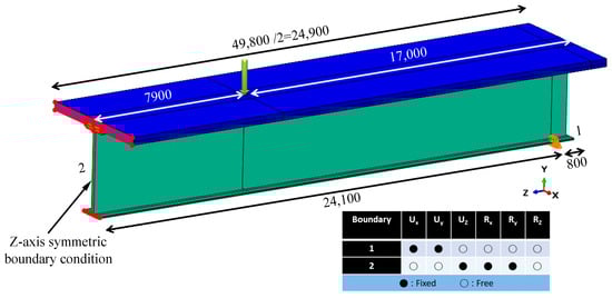A typical 4-point bending test analysis was conducted to determine the flexural moment strength at the loading point of prefabricated composite girders with different girder-to-deck connections. Only half of the prefabricated composite girder was modeled because of its symmetry. The distance between the loading point and the end of the girder is 17,000 mm. The supporting point of the prefabricated composite girder was restrained against the translational displacements in the X and Y directions. The surface at the mid-span of the prefabricated composite girder applied the symmetric boundary condition due to its symmetry so that the rotational displacements Rx and Ry and the translational displacement UZ of all nodes on the surface were restrained. Figure 13 shows the loading and boundary conditions.