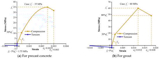 For the compressive properties of grout, the stress–strain relationship proposed by Kaushik et al. [19] was adopted. Kaushik et al. [19] found that the strain of grout at the maximum compressive strength (ε0) is taken as (0.010 to 0.013), and its ultimate strain (εcu) is taken as (0.017 to 0.019). The elastic modulus of grout (Eg) is calculated using Equation (15). Thus, in this analysis, ultimate strain (εcu) and the strain at the maximum compressive strength (ε0) of grout are assumed to be (0.018 and 0.012), respectively. The ultimate stress and limit stress of the linear elastic range are assumed to be (80 and 30) % of the compressive strength of grout, respectively. A tri-linear model was used. For the tensile properties of grout, the variation rule of tensile stress of grout is assumed to be similar to that of precast concrete. Figure 14b indicates the stress–strain relationship of the grout material. To model the grout material, the Concrete Damage Plasticity model was also used.