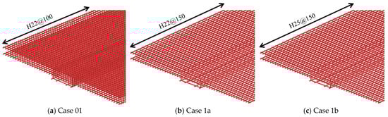 The influential parameter is also verified through numerical investigation. Table 5 indicates the content of the parametric studies. To be able to compare the cases with each other, only the parameters that do not affect the calculated flexural moment strength are investigated through numerical simulation. Based on the calculation results in Table 4, the FEA of two additional cases was conducted to evaluate the influence of the parameters (diameter and spacing of reinforcement) and compare with Case 01. From Case 01 (the reinforcement spacing was 100 mm), the reinforcement spacing was changed to 150 mm in Case 1a. The reinforcement spacing was also changed to 150 mm in Case 1b but in addition, the reinforcement diameter of 25 mm was used to replace that of 22 mm in Case 01 (ensure the full shear connection). Figure 17 shows the reinforcement arrangement for the cases of the parametric study.