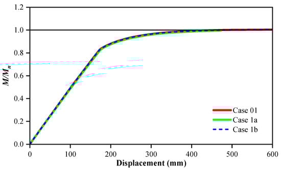 The moment ratio-displacement curve for cases of parametric study is indicated in Figure 18. The FEA results agree well with the calculation theory. In Case 1a, the flexural moment strength did not reach the nominal flexural resistance because the full shear connection was not satisfied in this case. The flexural moment strength in Case 1b was approximate to that in Case 01. These two cases had different spacing and diameter of reinforcement but both satisfied full shear connection. Therefore, it proves that the reinforcement spacing can be adjusted based on the influential parameters while still ensuring the connection performance.