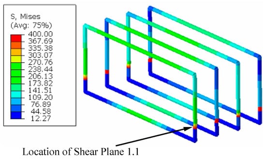 Figure 19 shows the Mises stress of reinforcement connectors at failure-mode shape for Case 1a. From Figure 19, reinforcement connectors were observed to obtain the yield stress at the shear plane 1.1 so the flexural moment strength did not reach the nominal flexural resistance in this case. The FEA result agrees well with the calculation theory.