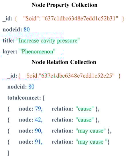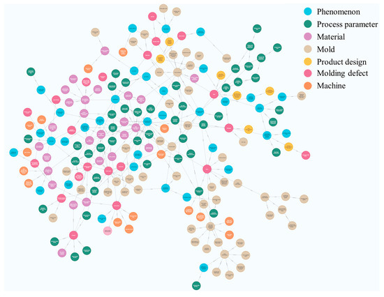 Neo4j [] is one of the most popular graph databases from recent years. Its built-in Cypher language enables the rapid editing of a knowledge graph. Additionally, Neo4j can visualize graphs using D3.js, which helps engineers to clearly view the relationships between the nodes, significantly reducing the maintenance costs of the graph. Therefore, in this study, Neo4j was selected as the database for storing the injection molding industrial knowledge graph.