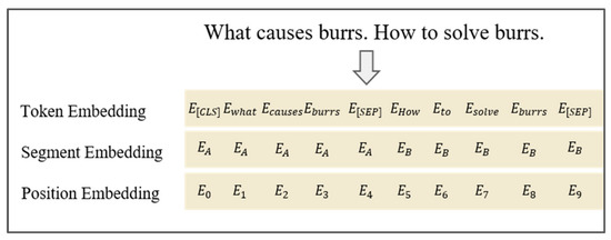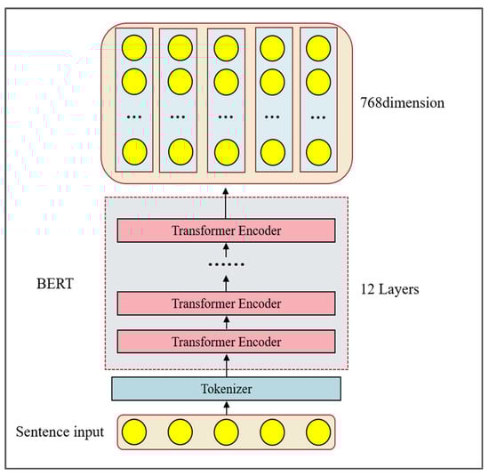 BERT is a pre-trained natural language model that was proposed by Google in 2018 []. It consists of 12 Transformer Encoders and is trained on a large amount of text data, with 1.1 billion weight parameters. BERT is capable of extracting 768-dimensional semantic features from input text data, as shown in Figure 3. Before reading text data, BERT requires preprocessing via a Tokenizer, as shown in Figure 4. This Tokenizer converts the text data into Token Embedding, Segment Embedding, and Position Embedding, which, respectively, record the character encoding, sentence segmentation annotation, and position information of each character in the text data. These three embeddings are used as inputs for BERT to extract the text data features. The purpose of this step is to convert natural language into a form that can be computed by a computer. The biggest difference between BERT and traditional natural language models is that, when extracting features for each character in the text data, BERT considers a character’s position and its corresponding context in the text data, which results in an excellent performance in interpreting text data.