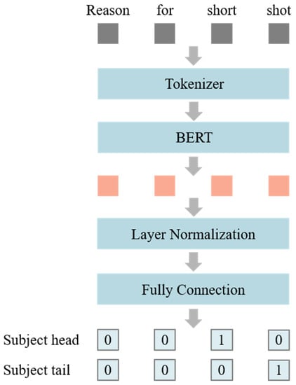 Figure 7 shows the workflow of the subject recognition model. A user’s question is encoded by the Tokenizer and then input to BERT for the text feature extraction. The extracted text features are processed by the Normalization Layer and then input to the fully connected layer with a Sigmoid activation function, which produces a 2-dimensional array to predict the head and tail positions of the subject.