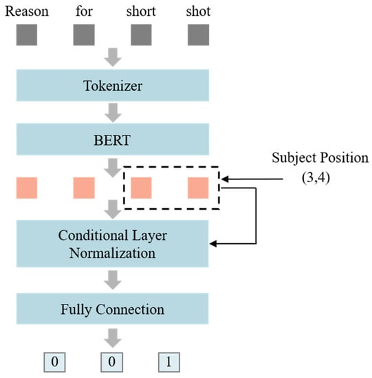 Figure 8 shows the architecture of the semantic classification model. We use the user’s question and the position of its subject as inputs to the model. The question is encoded by the Tokenizer and then input into BERT to extract the text features. After obtaining these text features, the model extracts the corresponding segment of the text features based on the position of the Subject, which is used as an input to the conditional layer normalization function, in order to process the text features generated by BERT. Conditional Layer Normalization can have different understandings of text data features based on the input of the conditional function, in order to cope with future user questions containing multiple subjects, and to judge their corresponding semantics based on different subjects. The features processed by Conditional Layer Normalization are input to the fully connected layer with Sigmoid as its activation function, outputting a one-dimensional array to represent the semantic classification results.