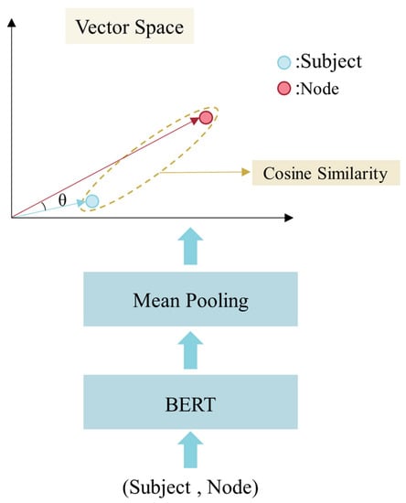 Therefore, in this study, we utilize the SBERT (Sentence-BERT) model, as employed in our previous research [], to identify the nodes in the knowledge graph that have similar concepts to the subject of the user’s question. Figure 9 shows the architecture of the SBERT model. When determining the similarity of concepts between the subject and nodes, the model extracts text features individually using BERT, processes the features through Mean Pooling, projects them onto a vector space, and calculates their cosine similarity as a basis for judging whether they have the same concept. In the vector space, entities with similar concepts have higher cosine similarity values, and vice versa.