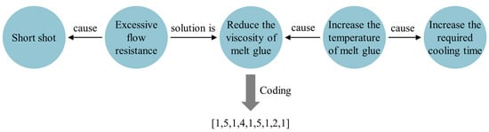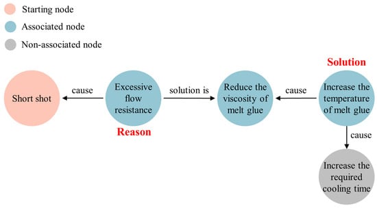 The injection molding industrial knowledge graph [] adopted in this study uses seven node categories: molding defects, process parameters, phenomena, molds, plastics, product design, and machine. It is accompanied by three types of edges: “causes”, “may causes”, and “solutions”, in order to express injection molding knowledge. The main difference between the two types of edges, “causes” and “may causes”, is that the edges of the “causes” type are mainly used to describe the fact that, if A occurs, then B will inevitably occur, such as: if the melt temperature rises, then the melt density will inevitably decrease. The edges of the “may causes” type describe the fact that, under specific circumstances, A will lead to B, such as: when the flow resistance is close to the critical value that the injection pressure can bear, an increase in the melt flow resistance will lead to the injection pressure being unable to overcome the flow resistance.