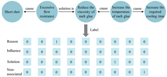 After successfully expressing the search path in the form of sequence data, the model can classify the nodes in the path by reading the sequence data. This study divides the nodes in the path into four categories: impact, cause, solution, and non-associated nodes. We can determine the relationship between a node and its starting node based on the classification results of the model. We will use a 4-dimensional one-hot vector to label the node category in the path as training data, and the labeling method for this is shown in Figure 12.