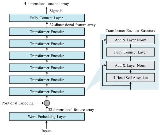 This study adopts a 6-layer Transformer Encoder with 4 Attention Heads to interpret the sequence data and generate a 32-dimensional feature array. The model architecture is shown in Figure 13. The feature generated by the 6-layer Transformer Encoder will be fed into a Fully Connected Layer with Sigmoid as its activation function, in order to produce a 4-dimensional one-hot array as the prediction result. The model is trained on 1100 training data for 100 epochs, with a learning rate of 0.0001. After training, the model achieves a prediction accuracy of 1.0 for non-related nodes and a prediction accuracy of 0.98 for the other three categories on 100 validation data.