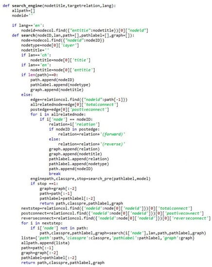 This study uses the Python programming language to establish a search engine that searches the graph based on loops, as shown in Figure 14. The search engine obtains the neighbor nodes of the starting node through MongoDB and inputs the paths between the starting node and each neighbor node into the model for a prediction through the loop. If the model predicts that the neighbor node is a non-associated node, the node will not be further explored. Otherwise, the neighbor node not in the current path will be obtained, and the above actions will be repeated until all the loops are completed, indicating the completion of the search. The detailed code can be found in Figure 15.