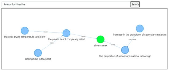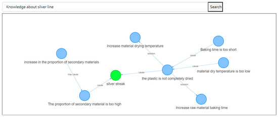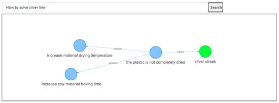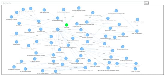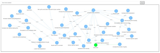 Figure 19 shows the search results for the question: “about short shot”, where the system returns all the knowledge related to “short shot” through a semantic classification. The search result contains a total of 65 entities. Figure 20 shows the search results for the user query: “short shot solution”, where the system returns the knowledge relevant to solving “short shot”. The search result contains 34 entities. By comparing these two search results, it can be seen that our developed system, which understands the user’s intent, can filter out unnecessary information and find more relevant knowledge from the related entities of the main subject, unlike the search mechanism proposed in our previous work [], which can only find all the related knowledge of the subject.
