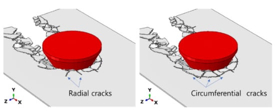 The direct method calculates the time series of ice loads through dynamic collision analysis using FE models of both ice and structures. The magnitude of ice load is significantly impacted by the failure mode of the ice; therefore, it is essential to accurately simulate the ice breaking and crack propagation that occur during the collision. In order to achieve this, Jeon and Kim [8] proposed a damage-based erosion model that models the interaction between ice and a structure and estimates the ice load by considering the erosion of ice elements. The direct method calculates ice load by using the ABAQUS commercial FE analysis program with a damage-based erosion model. As shown in Figure 2, the direct method can simulate the fracture patterns of level ice. As the structure encounters the edge of level ice, the initial occurrence is the formation of radial cracks. As the structure progresses, circumferential cracks begin to emerge, leading to the generation of broken ice flakes.