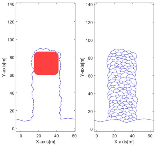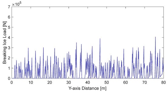 Figure 5 shows the visualized result of simulation using the semi-analytical method. The red square in Figure 5 represents the fixed structure, and the blue lines indicate the edges of the broken ice. Figure 6 shows the ice breaking load time series obtained by the simulation in Figure 5. Similar to the direct method, the semi-analytical method does not take into account the effect of the broken ice, so the breaking force is only observed as having zero to peak impact.