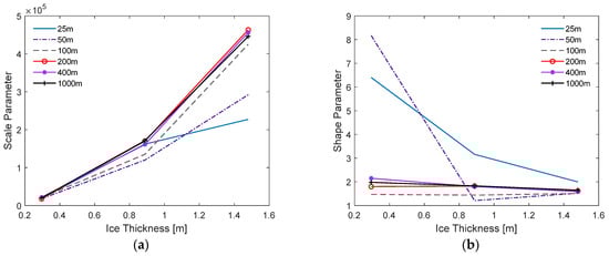 The subsequent paragraphs present an example of finding the effective length of level ice to obtain load data from statistical variables. For example, at velocity 9.18 cm/s, the parameters were calculated for the level ice moving as much as 25 m, 50 m, 100 m, 200 m, 400 m, and 1000 m. Figure 9a,b show the scale and shape parameters calculated by varying the moving distance of ice. The stability of statistical convergence was confirmed for ice movement conditions of 200 m or more, and the results of ice load calculation for 200 m movement were applied to the fatigue analysis. Similarly, the effective ice length was determined for the ice thickness-velocity combination indicated in bold in Table 4.