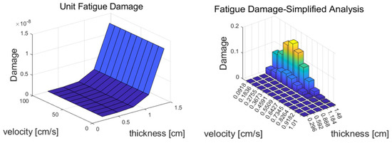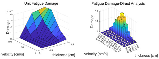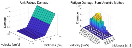 The final fatigue damage was calculated by multiplying the unit fatigue damage distribution and the moving distance distribution of ice for each stationary condition. Figure 13, Figure 14 and Figure 15 present the results of the fatigue damage calculations using each methodology. The left figure shows the fatigue damage per unit moving distance (200 m) for 55 ice conditions, while the final result obtained by multiplying the actual moving distance distribution is shown on the right. In contrast to the direct method, the unit fatigue damage was expressed as a function of only the ice thickness because the effect of the drift ice velocity was not considered in the simplified method and the semi-analytical method. Table 7 shows the final fatigue damage for the applied ice thickness conditions.