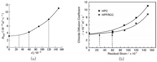 The effect of fatigue load on the durability of concrete has been attributed to changes in residual strain. Wang et al. [9] observed that compressive fatigue load had a significant effect on residual strain, and the concrete was subjected to compressive fatigue damage through residual strain in three stages; concrete damage accumulated more rapidly as the residual strain increased. Nakhi et al. [14], Gontar et al. [15], and Tran et al. [16] concluded that the Cl− permeability of concrete after fatigue load also mainly depends on the residual strain of concrete, which gradually increases as the residual strain increases. The stress level required, when the Cl− permeability of concrete started to increase significantly after unloading by multiple fatigue loads, was lower than that of concrete after unloading by one load, which is consistent with the gradual accumulation of internal damage in concrete under fatigue load. Jiang [17] and Sun [18] studied in detail the relationship between the residual strain and Cl− diffusion coefficient of concrete under bending fatigue load and Cl− coupling, and they found that the Cl− diffusion coefficient increased after the residual strain increased. Figure 1 shows the variation of Cl− diffusion coefficient with residual strain for (a) plain concrete and a (b) High-Performance Concrete (HPC) and High-Performance Fiber-Reinforced Cement Composite (HPFRCC). The Cl− diffusion coefficient increased significantly after the residual strain reached a certain critical value. This critical value was identified as the starting point for the concrete resistance to Cl− diffusion.