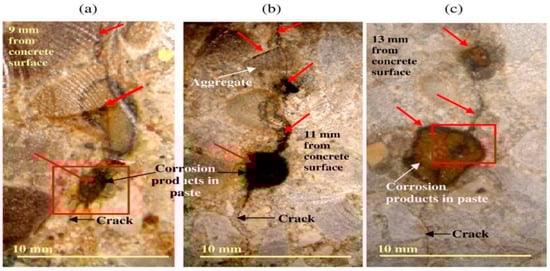 Distribution of corrosion products in dynamically loaded OPCC concrete (a) 9 mm from concrete surface; (b) 11 mm from concrete surface; (c) 13 mm from concrete surface. (Red arrows point to the location of visible corrosion products) [35].