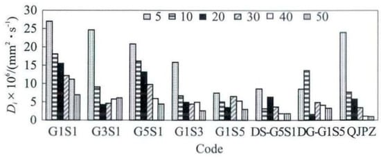 Additionally, the effect of the dry–wet ratio and number of dry–wet cycles on Cl− erosion in concrete was not negligible. Both the wet and dry ratio and the number of cycles directly affected the process of Cl− transport. Hong et al. [52] found that, during drying, Cl− lodged deeper in the concrete remains in the saturated pore solution for free diffusion, and lengthening the drying cycle could accelerate Cl− infiltration. Drying led to the formation of crystalline compounds being adsorbed deeper, and after the next wetting cycle, Cl− increased in the concrete. Additionally, the infiltration rate was found to be linearly related to the square root of the number of dry–wet cycles. Sutrisno [53] also assessed the effect of wet and dry ratio on Cl− infiltration, with significant differences in Cl− concentration and depth within the concrete with different wet and dry ratios. Xu [51] observed that the convective area gradually disappeared as the number of wet and dry cycles increased in samples with a dry–wet ratio of less than 1. As shown in Figure 7, for each wet/dry ratio case at different cycle days, the Cl− diffusion coefficient in specimens with a dry to wet ratio of ≥1 was slightly greater than that in specimens with a dry to wet ratio of <1.