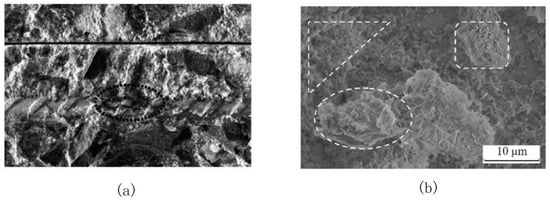 Dry and wet cycles allow Cl− to enter RC and corrode the reinforcement, ultimately reducing the load-carrying capacity of RC. Ye et al. [59,60] found that dry–wet cycles favor the penetration of Cl− into the concrete. Cl− intrusion into the interior reinforcement surface did not directly cause reinforcement corrosion but accumulated at the reinforced concrete interface until it reached a certain Cl− concentration, i.e., the critical Cl− concentration and rebar corrosion were accelerated [61,62,63]. As shown in Figure 8 [63], (a) the local corrosion of the reinforcement started, and the scanning electron microscope (SEM) was used to scan the corrosion site of the reinforcement, and it was observed that the triangular area in (b) was black corrosion products (Fe3O4), the elliptical area was red corrosion products (Fe2O3-xH2O), and the rectangular area was the passivation film on the surface of the reinforcement. It can be seen that the formation of a protective film mostly on the surface of the reinforcement starts to be gradually replaced by corrosion products and the reinforcement gradually rusts. Kawasaki [64] used SEM to assess the coupling effect of dry–wet cycles and Cl− erosion to clearly observe reinforcement rusting and the loss of the oxide film of the reinforcement surface, followed by cracks around the reinforcement leading to the destruction of the concrete protective layer. Wei et al. [65] assumed that Cl− reaches the surface of the reinforcement at a constant rate, and a good linear relationship existed between the rate of reinforcement corrosion and the Cl− content at the reinforcement–concrete interface when the rate of reinforcement corrosion was low, from which a critical Cl− concentration could be deduced, which was not present for the reinforcement inside the already broken concrete. Wei [66] and Li [67] found that, as the number of dry–wet cycles in the case of Cl− corrosion increases, Cl− accumulates rapidly on the surface of the reinforcement and corrodes it rapidly, reducing the bonding properties between the reinforcement and the concrete, leading to a significant reduction in RC residual strength and ductility and a consequent decrease in the ultimate load-carrying capacity.