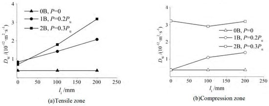 Figure 9 shows the variation in Cl− content with depth for beams subjected to 800,000 fatigue cycles at different fatigue stress levels. Figure 10 shows the effect of the upper fatigue load limit on the diffusion coefficient at different measurement points, where B represents the beam. As observed in Figure 9 and Figure 10, the Cl− content in the tension zone, as reported in the literature [86], was significantly greater than the Cl− content in concrete in the compression zone at a stress level of 0.3 times higher than the tensile strength, and it was seen that the Cl− diffusion coefficient in the tension zone was greater than the Cl− diffusion coefficient in the compression zone. The literature [87] showed that the Cl− diffusion coefficient in the compression zone was distributed along the span of the beam at a stress level of 0.3 times higher than the tensile strength, which was significantly greater than that in the tensile zone. The tests in the literature [86,87] were similar, and the opposite conclusions were obtained, indicating that the internal changes in concrete under the combined effects of fatigue load, wet and dry cycles, and Cl− erosion were complex, so they led to differences in the conclusions, and more relevant tests were needed to obtain conclusions regarding Cl− transport in concrete under the combined effects of multiple factors.