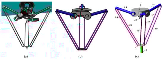 In addition, the kinematic modeling of parallel robots, especially the Delta robot, has been extensively addressed in the literature [,,,,] including forward and inverse modeling and kinematic optimization.