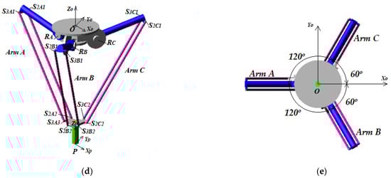 Delta parallel robot: (a) Delta Siax D3-1600 type robot; (b) CATIA model without payload; (c) ADAMS model with payload; (d) ADAMS model parametrisation; (e) arm arrangement.