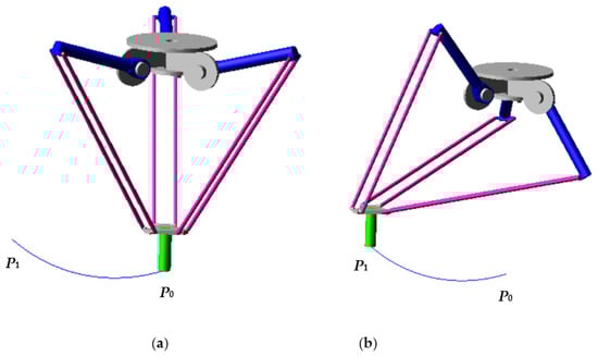 Cartesian trajectory of the Delta robot: (a) initial position; (b) final position.