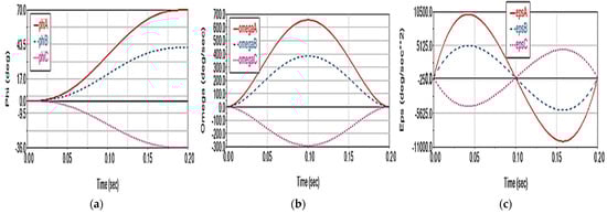 Motion trajectories in the active joint space (RA, RB and RC): (a) angular displacement; (b) angular velocity and (c) angular acceleration.