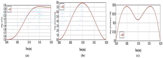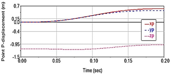 When polynomial movement trajectories of the fifth degree are applied to the active joints, a Cartesian trajectory P0P1 is obtained. This trajectory is characterized by the displacement of the characteristic point P along all three axes of the global coordinate system X0Y0Z0 (Figure 4), and it reaches a final position of rP = 1.245 m (Figure 5a). The trajectory also reaches a maximum speed of vP = 8 m/s at 0.1 s (Figure 5b) and a maximum acceleration of aP = 120 m/s2 at approximately 0.052 s and 0.158 s (Figure 5c).