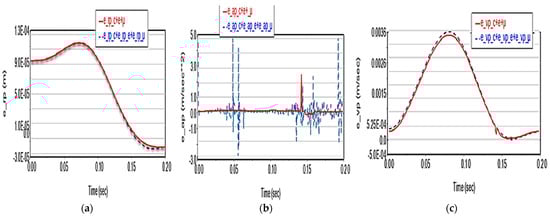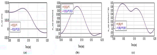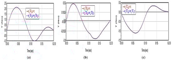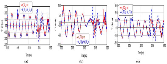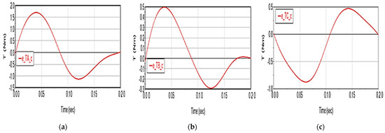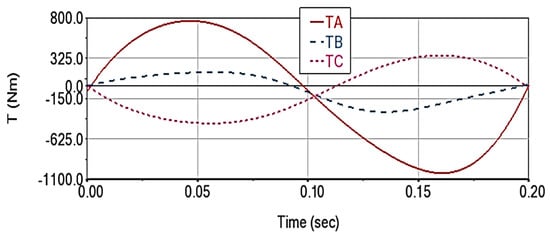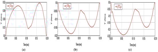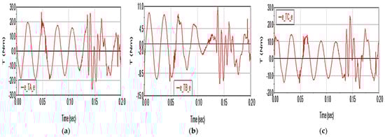 The cumulative effect of the two factors manifests similarly in the case of motor moments: it leads to the increase in deviations up to 2.12 N·m (additive case) for TA torque (Figure 17a), up to 0.36 N·m (TB torque, Figure 17b), 1.11 N·m (TC torque, Figure 17c). The moment deviations still have the same value also in the case of summing the effects, when their values are the same compared to the case of summing the effects, without affecting the shape of the curves.