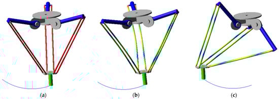 The CAD model of the Delta robot: (a) in ideal case, and with flexible links at (b) trajectory start point P0; (c) trajectory end point P1.