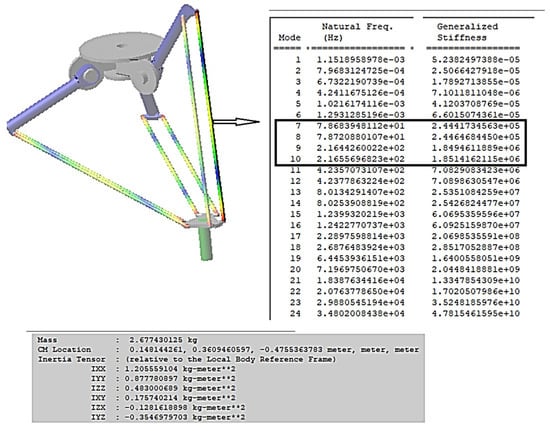 In the hypothesis of considering the flexibility of the flexible elements of the Delta parallel robot (Elements 2 and 3 on each arm, see Figure 8) and limiting the analysis to the first 10 vibration modes (with natural frequencies lower than 250 Hz, as the effect of higher frequencies is negligible—the principal characteristics are presented in Figure 9), the results represented in Figure 10 (motion deviations) and Figure 11 (torque deviations) are obtained.