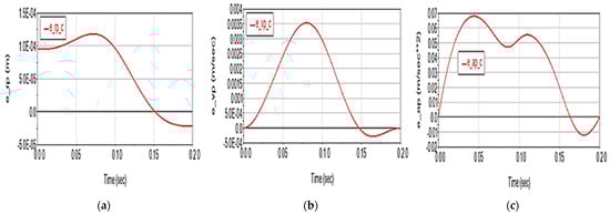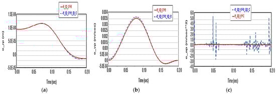The deviation from the characteristic point trajectory is up to 1.18·10−4 m (Figure 12a), with a velocity deviation of up to 0.0035 m/s (Figure 12b) and an acceleration of up to 0.068 m/s2 (Figure 12c). Compared to Scenario 2, the displacement deviation on the trajectory is significantly higher (~20 times higher), but the deviation of the acceleration on the trajectory is much lower (~70 times lower).