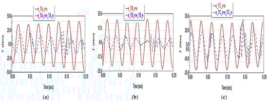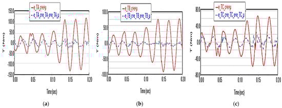 The maximum deviation of the driving torques shows the same type of harmonic variation as in the scenarios where the elasticity factor is considered. It reaches ~120 N·m vs. ~20 N·m (in the additive case) for TA (Figure 21a), ~80 N·m vs. ~10 N·m for TB (Figure 21b) and ~70 N·m vs. ~10 N·m for TC (Figure 21c).