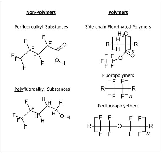 The broad category of hundreds of synthetic chemicals known as per- and polyfluoroalkyl substances (PFASs) is widely utilized for a wide range of applications, from Gore-Tex materials and anti-adherent pans to firefighting foams. They are, however, more frequently identified as environmental contaminants, and some of them have been connected to harmful effects on human health [1]. The PFAS backbone is constituted by single-bonded carbon atoms with fluorine atoms covalently bonded to the alkyl chain, one of the strongest in chemistry, and therefore PFAS do not break down easily in the environment [2]. In addition, PFASs can be classified in different families [3]: perfluoroalkyl substances and polyfluoroalkyl substances for the non-polymers group; and fluoropolymers, perfluoropolyethers, and side-chain fluorinated polymers for the polymers group. The chemical structures of the different classes are depicted in Figure 1.