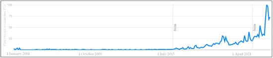 Interest over time of the word “PFAS” in Google searches since 2004. Data source: Google Trends (https://trends.google.com/trends/explore?date=all&q=PFAS (accessed on 12 May 2023)) [7].