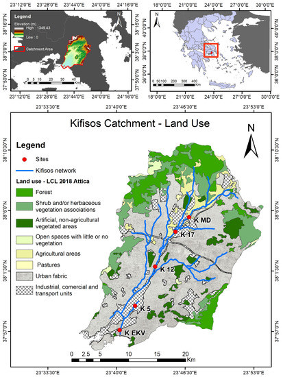 Concerning land use, Kifisos catchment is characterized by multiple anthropogenic pressures, mainly industry, agricultural and residential use. The built-up areas (houses, roads, industries) cover most of the downstream parts of the catchment, and are estimated to exceed 70% while they are still increasing [23]. At two distinct parts along the Kifisos route, industries and manufacturing businesses have been operating on both sides of the river, functioning as unplanned and informal industrial zones. In the upstream areas, forests and shrubland are dominant, but have been significantly impacted by 2007 and 2019 wildfires. This is also where land used for agricultural and livestock use is located. Kifisos has undergone extensive river engineering in the last 13 km of its route, addressing issues of flood control, drainage system management and the road network; Kifisos river is canalized, alternating from fully boxed to open cross-section embankment. As a result, its riparian zone for this stretch was practically eliminated. Moreover, Kifisos Avenue a high-traffic-density road, and the central axis of Athens highway network was constructed over the canalized river. Five sampling locations were selected that are distributed along the drainage catchment from its upstream part, where limited pollution sources exist, to the river mouth (Figure 1).