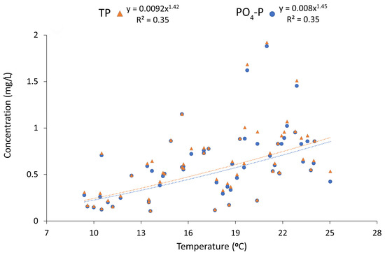 As the majority of the data did not fit a normal distribution, Spearman’s correlation analysis was then applied to check for covariances. Spearman’s correlation analysis showed that temperature has significant (p < 0.05) correlations with nutrients, particularly with phosphorus (Table 2). Regression analysis for orthophosphates and total phosphorous as function of temperature yielded values (R2) 0.347 and 0.346, respectively. Figure 2 also indicates a strong seasonal trend among temperature and high nutrient values, especially in the summer season (upward-sloping power curve; June–July–August).