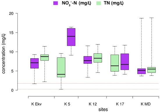 Distribution of NO3−-N and TN values at the sampling sites from upstream (K MD) to the river mouth (K Ekv). The dotted lines indicate good (green) and bad (red) thresholds for NO3−-N according to the WFD provisions.