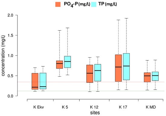 Distribution of PO4-P and TP values in the sites from upstream (K MD) to the river mouth (K Ekv). The dotted lines indicate good (green) and bad (red) thresholds for PO4-P according to the WFD provisions.