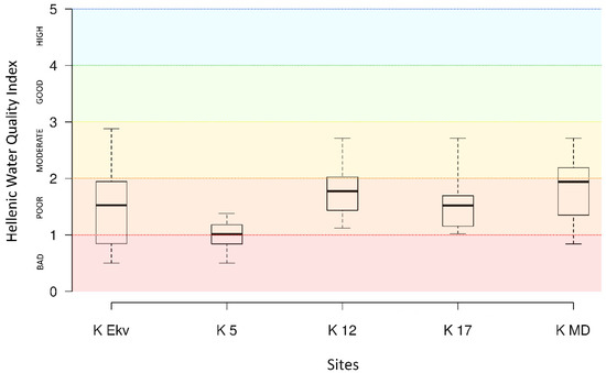 According to the HWQI, the sampling sites K Ekv, K 12 and K 17 could be characterized as of bad or poor physicochemical status in the majority of the measurements. Approximately 50% of the samples in K MD (upstream) and 25% of the samples in K Ekv and K 12 indicated moderate physicochemical quality (Figure 5). The worst results in terms of WFD quality class were recorded in K 5, with more than 50% of the samples classified as of bad quality and all the rest as of poor quality. K 17 follows, with almost 80% of the samples classified as of poor physicochemical quality.