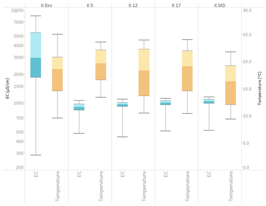 Figure 6 represents electrical conductivity (EC) (left axis) and temperature (T) (right axis) observations per sampling site. It was observed that the EC concentrations ranged from 286.3 μS/cm to 8146 μS/cm in water obtained from K Ekv. The wide variation at this sampling site, which is considerably different from the rest, is mainly due to seawater influence. The highest EC values in most all other cases were close to 1000 μS/cm. Such a value is within the expected range for fresh water in an urban river. K 17 and K MD had proximity in the EC minimum values (K 17: 513 μS/cm and K MD: 519 μS/cm), median (K 17: 1012 μS/cm and K MD: 1043.5 μS/cm) and maximum values (K 17: 1117 μS/cm and K MD: 1160 μS/cm). Water temperatures ranged from 9.4 to 25 (°C), which would pose no adverse effects on living organisms. K 12 and K 17 have proximity in their values, while K MD maximum, median and minimum values are lower compared to the other four sites.