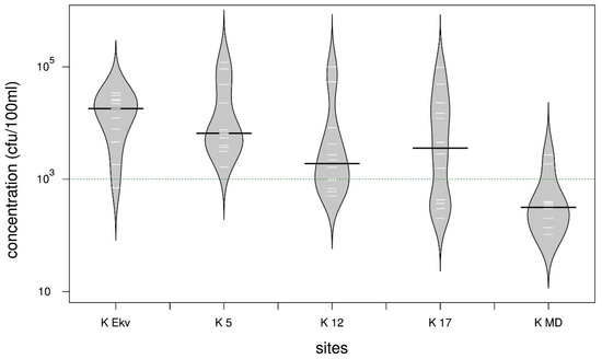 Extremely high values were also found at the K 12 and K 17 sites (100,000 cfu/100 mL), while the lowest median value of E. coli was observed at K MD (Figure 7). These results are in accordance with the nutrient findings mentioned above since there is a tendency for pollution levels to increase from the upstream to the downstream part of the river, with the exception of K 5, which is a small branch of the river that is inside an industrial area and is heavily polluted.