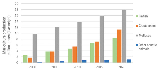 Based on the salinity, there is freshwater and saltwater production, and based on the habitat, there is land-based or water-based aquaculture [4]. Mariculture production is the production of aquatic animals in salt water in a marine environment under the impact of waves, sea currents, wind, and other factors. Nowadays, global mariculture production accounts for approximately 40% of total aquaculture production; approximately 75% of mariculture production is related to crustaceans and molluscs production; while the remainder belongs to finfish production, including high-value marine and brackish water species (e.g., salmon, bream) in intensive farming systems in cages and net pens [5]. The increase in total mariculture production over the years is illustrated in Figure 1 which was generated according to data available in [1].