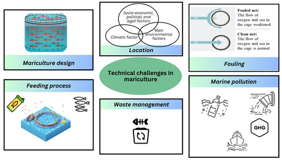 To deal with the environmental problems, but also to improve the existing production, both producers and researchers are continuously looking for ways to ensure the long-term viability of production practices, their efficiency, and profitability. Gavrilović and Jug-Dujaković [17] investigated water quality, the increase in the number of diseases, and other factors which force producers and researchers to develop and apply new, more ecologically and economically acceptable technologies. Technical challenges in mariculture are illustrated in Figure 2. With the depletion of marine resources, efficient fishing output becomes increasingly important. Production input intensity, the scale of the operation, operator experience, education and training, adoption of new technology, and a variety of other management issues have an impact on production efficiency [18]. According to Rguez-Baron et al. [19], challenges to the development of sustainable mariculture production are: