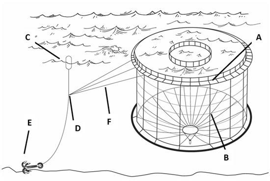 Schematic drawing of a cage and mooring system: A—HPDE pipe (high-density-polyethylene); B—net cage; C—mooring buoy; D—corner plates or ring; E—anchor; F—grid rope (poly steel rope).